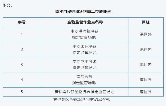 三、南沙國(guó)際冷鏈指定監(jiān)管場(chǎng)地計(jì)劃于10月25日開展冷鏈查驗(yàn)作業(yè),但目前暫不具備凍肉和冰鮮水產(chǎn)品指定監(jiān)管場(chǎng)地資質(zhì),因此進(jìn)口這兩種冷鏈產(chǎn)品的企業(yè)在填寫“貨物存放地點(diǎn)”時(shí),不得填寫南沙國(guó)際冷鏈指定監(jiān)管場(chǎng)地作為“貨物存放地點(diǎn)”,其他冷鏈產(chǎn)品按第二條要求執(zhí)行。