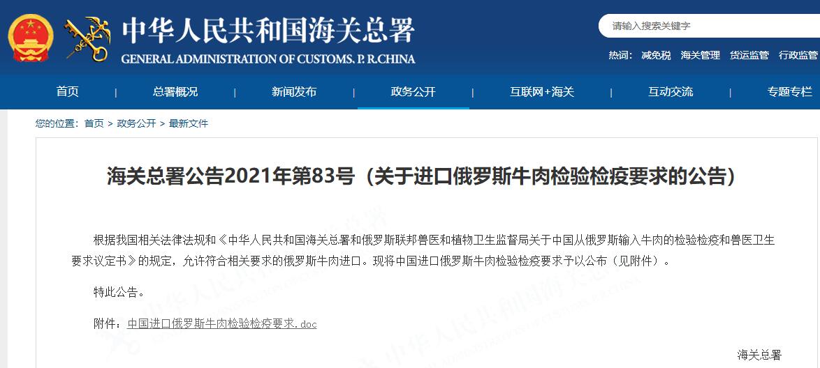 2021年10月18日,海關總署發布2021年第83號公告:允許符合相關要求的俄羅斯牛肉進口,詳情如下: